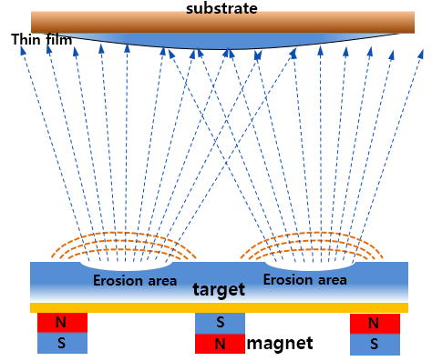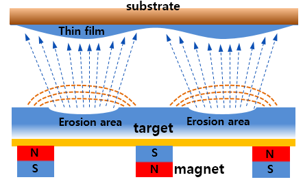 타겟 아래에는 대부분 마그네트론이 장착되어 있는데, 이런 경우는 조금 다릅니다. 마그네트론은 스퍼터링 효율을 크게 증대시켰지만, 대신에 타겟에 집중적으로 스퍼터링이 발생하는 영역이 생기게 되고 그 부분을 erosion 영역이라고 했습니다. 이것을 박막의 입장에서 생각해 본다면 결국 erosion 영역과 바로 마주보고 있는 기판부분은 스퍼터링 되어 들어오는 입자수가 가장 많다는 뜻이 됩니다. 그래서 박막의 두께는 웨이브를 그리며 변화하여 중심부가 얇아지는 현상이 나타나는데, 이 현상은 항상 그런것이 아니며 타겟과 기판과의 거리에 따라서 오히려 중심부의 두께가 두껍게 나타나기도 합니다.
