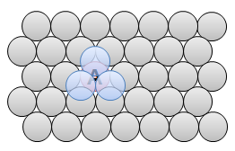 이번에는 FCC 구조에서 최대조밀면이라고 하는 (111)면을 살펴보겠습니다. (111)면의 표면 원자들은 원자 하나에 6개가 둘러싸고 있습니다. 그리고 A 의 표면원자 위로 원자가 들어갈 수 있는 빈 공간은 3개 뿐 입니다. 즉, 원자 하나당 끊어진 결합은 3개가 존재하고, (111)면의 원자 하나당 표면 에너지는 (ε/2 x 3) 이 됩니다. (100)면의 원자보다 에너지가 낮습니다.