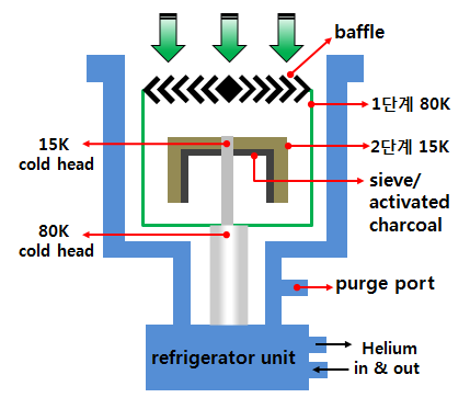 진공챔버에 장착된 크라이오펌프. 아래쪽으로 compressor가 연결되어 있다.
