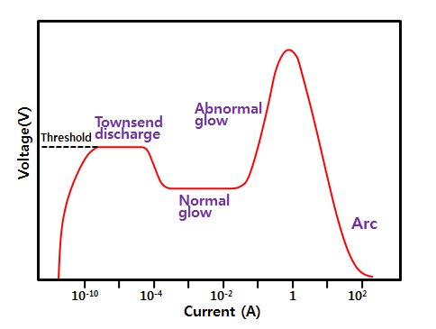 그림. DC 글로우 방전의 전압-전류 특성 곡선 그래프