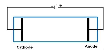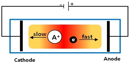 앞의 형광등 이야기를 할 때 나온 방전의 과정을 자세히 살펴보자. 방전은 플라즈마를 만드는 방법 중 가장 흔하게 사용되는 방법이다. 먼저 위 그림과 같은 장치를 생각해 보자. 밀폐된 유리관으로 만든 방전관 안에 적당한 압력의 기체를 채워넣고, 양쪽에는 전극을 장착한 뒤 밀봉한다. 그리고 전극에 직류인 DC(Direct Current)를 걸어준다.