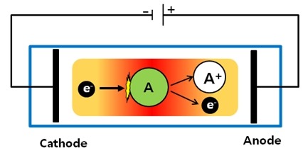 보통 기체 내에는 자연상태에서도 이온화되어 생성된 전자(background electron)들이 일부 존재하며 전극표면에도 전자들이 존재할 수 있는데, 이들을 초기 전자 또는 씨앗 전자 라고 부른다(경우에 따라서는 음극 자체에서 아예 전자를 방출해서 초기 전자를 만들기도 한다). 양단에 있는 전극에 전기장이 가해지기 시작하면 방전관 내부의 초기 전자들은 전기장에 의해 힘을 받아 가속되며 전극쪽으로 이동하며, 도중에 기체원자와 만나서 충돌하게된다. 그러나 전자가 가속된 처음에는 낮은 속도 때문에 충분한 에너지가 없어 기체원자와 충돌해도 기체를 이온화 시키지 못하고, 원자내 전자를 여기 시키지도 못한다. 단순히 충돌로 인한 운동량만 전달되어 기체들은 방향만 바꿀 뿐인데 이때를 탄성충돌 영역이라 한다. 전자가 충돌없이 오랜 시간 가속되거나, 전기장의 세기가 높아 짧은 시간에도 전자가 충분한 가속력을 얻게 되면, 높은 에너지를 가지고 기체원자와 충돌하여 이온화를 시키는 비탄성충돌이 발생할 수 있다.