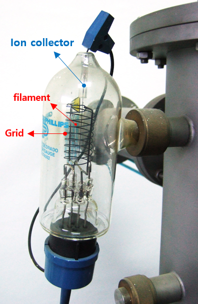열전자형 이온게이지는 내부에 전자 방출용 필라멘트, 그리드(grid) 라고도 불리우는 전자 콜렉터, 그리고 이온 콜렉터가 있습니다. 필라멘트는 보통 텅스텐(W)이 사용되거나 레늄(Re)과 란탄보라이드(LaB6)로 만든 재료가 주로 사용됩니다. 필라멘트에 전류/전압을 공급하여 가열되기 시작하면 여기서 열전자가 방출되고, 열전자는 나선형으로 감긴 그리드 주변을 따라 운동하다가 마지막에는 그리드에 포획됩니다. 그 과정에서 전자는 주변 기체들과 충돌하여 이온화를 시키게 되며, 이온화 되면서 나온 전자는 역시 그리드에 포획되어 전류로 변화하고, 양이온은 이온 콜렉터로 수집되죠. 이때 이온 콜렉터에서 발생한 이온젼류를 측정하여 압력으로 변환하게 됩니다. 그런데 어느정도 이상 높은 압력에서는 이온이 너무 많이 발생하게 되고, 이들 이온이 콜렉터 쪽으로 모두 모여버리면 공간전하가 나타나서 측정이 어렵습니다. 물론 요즘 장치들은 그 전에 안전장치가 작동해서 저절로 꺼지게 만들어 놓았습니다.