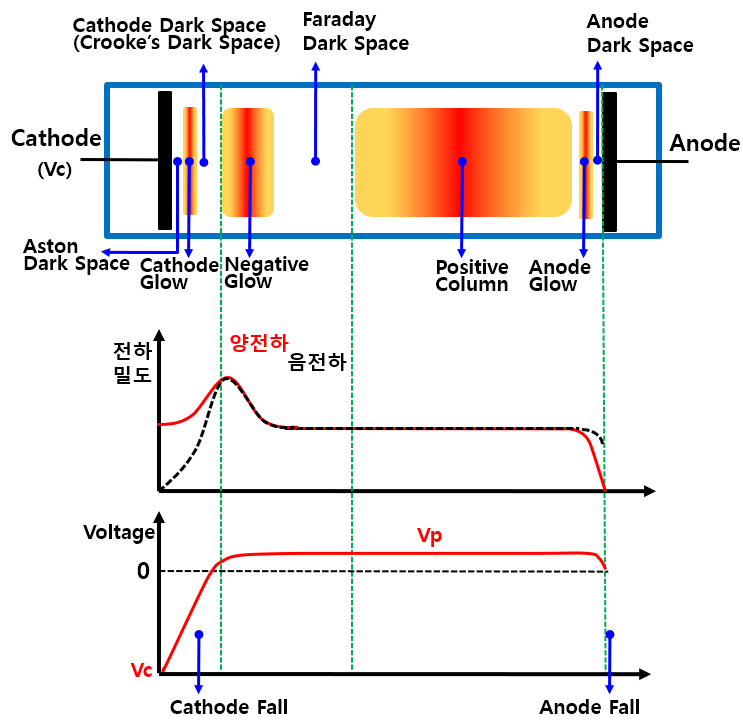 위 그림은 직류 글로우 방전시, 방전관에서 나타나는 방전의 형태와 전하밀도, 그리고 전기장과의 관계를 나타낸 것이다. 방전관 내에서는 글로우 방전 하나의 방전형태만 나타나는 것이 아니라 음극에서 양극으로 가면서 아스톤암부, 음극 글로우방전, 크룩스 암부, 부의 글로우 방전, 패러데이 암부 등의 순서로 여러가지 형태가 같이 나타나게 된다. 그러나 여기서 이 모든 방전의 형태를 여기서 다 다뤄야 할 필요는 없을듯 하다. 방전이나 플라즈마 자체를 연구하는 사람에게 있어서는 각각의 부분에 관하여 자세히 알아야 하겠지만, 앞으로 여기서 언급하고자 하는 것은 글로우 방전을 이용한 박막으로의 응용이다. 그래서 우리에게 중요한 부분은 음극 글로우 방전 영역이 되므로 이 부분에 집중할 필요가 있다.
